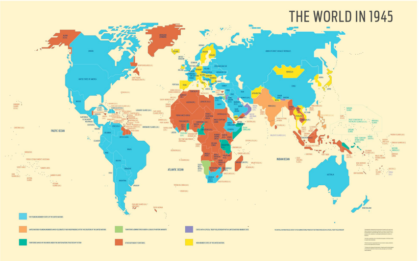From the UN Special Committee on Decolonization: A depiction from 1945 showing areas that needed to be decolonized and be enabled towards self-determination. Alaska and the Hawaiian Islands are both shown along with all of Polynesia, Indonesia and Malaysia.